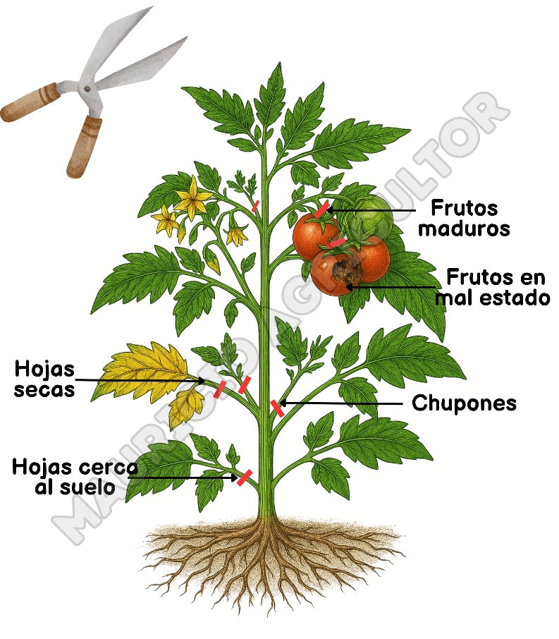 - Al quitar el exceso de follaje, los frutos y hojas restantes reciben más luz solar, lo que mejora la fotosíntesis y la maduración de los tomates.
